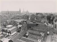 De binnenstad gezien vanaf een ladderwagen in zuid-westelijke richting, 25-09-1985. Links de Wilhelminastraat. Rechts is nog juist de Agnietenkapel zichtbaar. Centraal staat de Waag met daarachter het stadhuis. In de achtergrond zijn vaag de St.-Janskerk en Gouwekerk zichtbaar. - Turfmarkt, gebouw Vrije Evangelische Gemeente in de steigers voor onderhoud