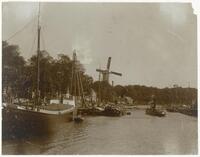 Gezicht op Veerstal (halverwege) en Nieuwe Veerstal vanaf de Hollandse IJssel noordoostwaarts, met de molen 't Slot. c. 1904. -