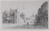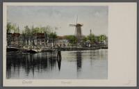 Gravure (tekening ?) door G.J. Verspuy van de Waterpoort aan de Veerstal. 1862, - Het begin van de Hoge Gouwe en Lage Gouwe met de St.-Janskerk op de achtergrond, 1946.