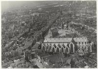 Luchtopname van een groot gedeelte van de binnenstad met de St.-Janskerk op de voorgrond, daarachter het stadhuis, strekkende tot voorbij de Kattensingel en Blekerssingel. -