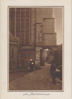 Opnamen van de Grote of St. -Janskerk Achter de Kerk, 1926. De steunbeer richting kosterwoning. - 't Buurtje, omheind dichtgetimmerd schipperswachthuis, twee heren in overall lunchen op het bankje ervoor