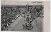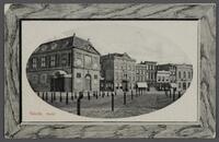 De Markt vanaf het (gemanipuleerde) Waaggebouw zuidoostwaarts tot aan gebouw Arti Legi. c. 1910. Afbeelding in ovaal binnen kunstlijst - Mapje met verschillende opnamen (prijs â 1,--) in de stad, uitgegeven t. g. v. de sierbrulcraghtwaghentoght (puzzlerit voor automobilisten) in de Gouda-Week van 30-07-1954. Gevelsteen In Haestrecht aan gevel in de Peperstraat.