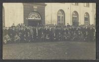 Kazernestraat, voor de kazerne, groepsfoto van de Bijzondere Vrijwillige Landstorm o.l.v. burgemeester Mijs -