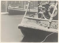 Detailopname vanaf het Regentesseplantsoen van een besneeuwd schip in de Kattensingel -