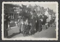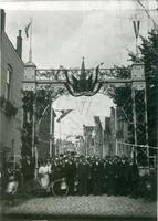 Groepsfoto tijdens Koninginnefeest in de Tuinstraat (De Zak). Vlnr.: 3. v.d. Want?, 4. Simon Meewezen, 5. van Leeuwen (kuiper), 6. Korevaar (groentehandelaar), 7. van de Hondel (caféhouder), 8. Furrer, Jan.
