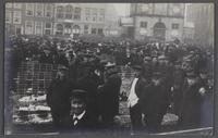 Markt met aktiviteiten tijdens de marktdag, ca. 1910. Drukte tegenover de Waag bij de varkenshokken - Het bijkantoor van de PTT op de hoek Bernadottelaan / Bunchestraat.