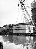 Gezicht op de bebouwing aan de Oosthaven vanaf het St. Catharinagasthuis noordwaarts, gezien vanaf de Westhaven, ca. 1946. - Achter de Kerk, Goudse Gaper met zijn restaurateur aan de buitenwand van voormalig restaurant De Zes Sterren