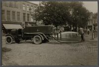 Een motorsproeiwagen van de Gemeentelijke Reinigingsdienst in aktie op de Nieuwe Markt -