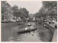 Gouda waterstad, mei - juni 1988. De Hoge en Lage Gouwe gezien richting Visbanken met roeibootjes. - Klimopstraat, 1966. Klimopstraat 1 t/m 17 westzijde.