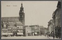 Ansichtkaarten van de Markt, c. 1917. Gezicht op de zuidpunt met daarboven gedeeltelijk de St.-Janskerk rechtsonder de Wijdstraat. -