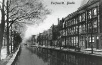Ansichtkaart van de Turfmarkt oostzijde vanaf de Lage Gouwe. -