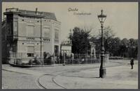 De splitsing in de Crabethstraat halverwege met de trambaan, ca. 1905. - Actievoerders in de Boelekade onder een spandoek Geen parkeergarage in onze buurt, 13-03-1980. Midden - met bril - mevrouw Annie Heus.