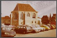 Zijaanzicht van de gerestaureerde Agnietenkapel aan de Nieuwe Markt met rondom geparkeerde auto's, juli 1975. -