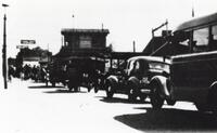 Filevorming bij de oude spoorwegovergang naar de Spoorstraat vanaf de Ridder van Catsweg en Graaf Florisweg. ca. 1930. -