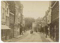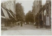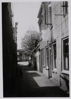 De Nieuwehaven met de Vrouwetoren noordoostwaarts. - Een winkel in electrische huishoudelijke apparatuur op de hoek Zeugstraat 72 / Speldenmakerssteeg.