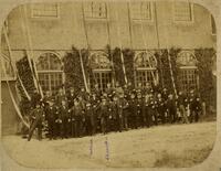 Groepsfoto van personeel van de brandweer op het Stadserf aan de Nieuwehaven, staande onder uithangende slangen. Voorste rij 5e van links Van Bemmel, 6e van links opperbrandmeester L. Burgersdijk. Een brandspuit is nog vaag zichtbaar -
