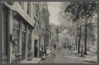De Wachtelstraat vanaf het Bolwerk zuidwaarts; uiterst links meubelzaak J. v.d. Ende op nr. 28. c. 1917. - Spieringstraat, blik vanaf de achterzijde van de moskee op daken, schutting en deur naar plat dak met gedeeltelijk glas