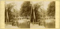 Blekerssingel, brug - Gezicht op het Zwaansgat in Gouda vanaf de Peperstraat. Op de achtergrond is de deur te zien die leidt naar Machinefabriek De Weger gevestigd aan De Bogen, 4 mei 1965