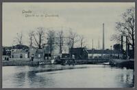 Gezicht op de Vest met de gasfabriek vanaf de Nieuwe Gouwe, op de voorgrond de Rode brug, ca. 1920 - Een overzicht van het sportveldencomplex aan de voet van de Goejanverwelledijk, gezien vanaf de Sportlaan.