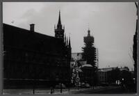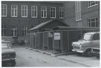 De bouwketen op de parkeerplaats van de Groeneweg ten behoeve van de bouw van het nieuwe archiefgebouw, februari 1976. - Opnamen van de Schouwburg en sociëteit Ons Genoegen in gebouw Kunstmin aan de Boelekade. Exterieur van de Schouwburg en Kunstmin