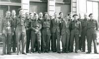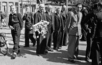 Groepsfoto van Goudse BS'ers voor het pand Gouwe 37. Vlnr Amelink, een onbekende, J. Zoer, Vob de Graaf, onbekend, Th. Gerritsen, W. Brus, commissaris Hess, M.A. de Korte, J. Groenendijk, W. Mulder, J. Feit Zoet, Jan Verhoek, Kooistra, Bennis, Lafeber, Vingerling, W. van Rees. - Bogen, voorzijde De Weger Machinefabriek