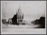 Reproductiefoto naar lithografie door Hendrik Hermanus Vetter (Gouda 1791 - Delft 1865) van de Markt met het stadhuis en op de achtergrond gebouw de Waag -