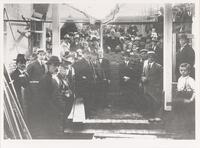 Eerstesteenlegging voor de bouw van de Chr. Gereformeerde Kerk aan de Hoge Gouwe door burgemeester Gaarlandt en Ds. Kroes (met echtgenote). Aanwezigen o.a. de predikanten Minderman, G. Bos, Klumper (klein brilletje), August Dubois en de zangvereniging Laus Deo. Rechtsonder jongetje van Wingerden, da - Spieringstraat 2 t/m 12 in richting van Willem Vroesenhuis