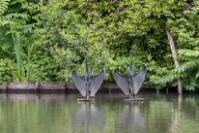 Kunstwerk 'de Aalscholvers' in een vijver in het Van Bergen IJzendoornpark - Het Van Bergen IJzendoornpark vanaf de Nieuwe Gouwe, 1966.