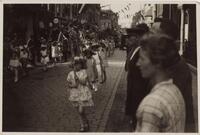 De viering van Koninginnedag, ca. 1925. Optocht van boogdragende kinderen op de Kleiweg. - Mapje met verschillende opnamen (prijs â 1,--) in de stad, uitgegeven t. g. v. de sierbrulcraghtwaghentoght (puzzlerit voor automobilisten) in de Gouda-Week van 30-07-1954. Woningen aan de Blekerssingel.