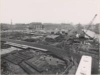 Vanuit een ladderwagen gezicht op de bouwlokatie Varkenmarkt (Nieuwe Markt). 07-04-1986. Gezicht op de parkeerplaats met rechts de Blekerssingel. - Plaatsing kerstboom op de Markt, 5 december 1983.