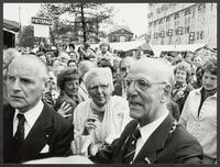 Bezoek van koningin Juliana aan Gouda, 1978. Koningin en burgemeester op de Markt te midden van publiek.