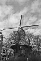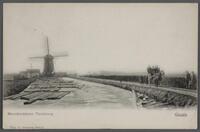 Moordrechtse Tiendweg, met houtvlotten in een vaart; aan het einde een windmolen. -