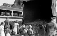 Markt, kinderen gaan op reis met een bus en worden uitgezwaaid door hun ouders - Nieuwehaven, leider van Gemeentebelangen Gouda (GBG) voor de brandweerkazerne bij het standbeeld van een brandweerman