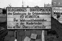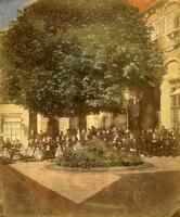 Verzamelde grote en kleine weeskinderen op de binnenplaats van het Weeshuis aan de Spieringstraat bij de poort. - Hoge Gouwe, op de voordeur van verwaarloosd pand nr. 147 is 'M '75' gekalkt