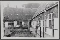 De binnenplaats van het Roomse hofje (hofje van Buytenwech) aan de Raam. c. 1930. Boven het dak een fragment van de molen. -