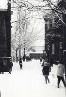 De besneeuwde binnenplaats van de kleuterschool de Kabouter aan de Groeneweg (voormalige Klaas de Vriesschool) met spelende kleuters. Januari 1968.