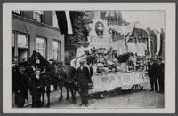 Reclamekaart van een praalwagen in de Crabethstraat van de NV Goudsche Melkinrichting, ca. 1925. -