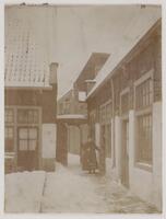 Het Roomse hofje (hofje van Buytenwech) aan de Raam. winter 1923. Exterieur in de sneeuw met een bejaarde dame bij een poortje. -