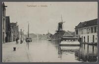 De Turfsingel aan weerszijden vanaf de Veerstraat (met bijbehorende veerpont) noordwaarts; rechtsachter de molen De Korenbloem. ca. 1916. -