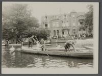 Toeschouwers op de Kattensingel tijdens een wedstrijd voor kano's (?). c. 1930. - De Kortestraat, jongeren over het houten bruggetje vanaf wijkcentrum 't Wiel richting Hammarskjoldhof