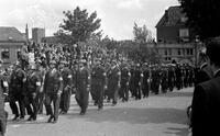 Fluwelensingel, tribune met publiek, parade Binnenlandse Strijdkrachten - Rolandstraat, straatbeeld met flats en geparkeerde auto's bij perkjes groen met bomen