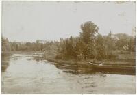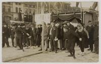 Schaatswedstrijd op de Kattensingel, 2 februari 1917. Links: C. Dijkstra en S. Bootsma uit Lemmer (1e prijs). Rechts: J. Coehoorn (Lemmer) en mej. R. van der Groot (Sloten) (4e prijs). (Laatstgenoemde dame won in de vrouwenwedstrijd de 1e prijs.). Onder nr. 5 (met hoed): C.H.W. Heusdens, directeur v - Klein Amerika, Gouda. Het bronzen beeld van de indiaan in het plantsoen mist zijn speer die ludiek is vervangen door een tulp.