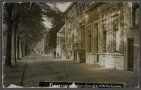 De Fluwelensingel gezien in de lengte langs de huizen, met het wegdek ervoor, ca. 1915. - Buurtje, Gouda. Beeld "Lucia", de Zweedse godin van het licht, vervaardigd door beeldhouwster Corinne Franzen - Heslenfeld en nu volledig gerestaureerd door de Goudse steenhouwer A. Roodbol. Op de achtergrond Kaarsenfabriek Unichema.