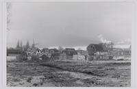 Het slaan van de eerste paal voor de bouw van bejaardenflats aan de Baan, 10-4-1975. Overzicht van het bouwterrein zuidwaarts - Nieuwehaven, monumentale woning nr. 208 en 208a