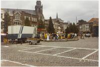 Kleurenfoto van de oostzijde van de Markt tijdens een kermis. -