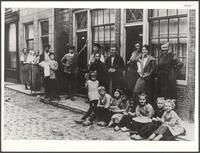 Spieringstraat, bewoners naast de toegang tot het Swanenburghshofje. Staand v.l.n.r. mw. De Hoog met baby Sjaan - mw. Van der Pool met zoon - onbekend - weesjongen - weesjongen - weesjongen - mw. de Blijker - mw. Van der Laan - Trui de Blijker - onbekend. Zittend v.l.n.r. meisje Van der Eng (met s - Opnamen van de Wijdstraat, 1961 - 1965. De bloemenzaak Thia op no. 7. publ. GC 31-03-1962.