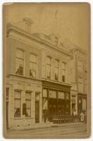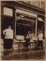 Voorgevel van vleeshouwerij T. van Vliet met in de deuropenening T. van Vliet, ca. 1910. Met 2 slagersfietsen in de Zeugstraat. -