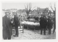 Diverse opnamen uit het boekje Gouda's Markets, Goudsche Markten. Een bak met biggen op de Markt met handelaren. -