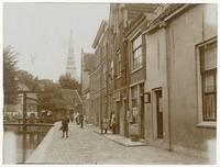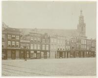 Een gedeelte van de bebouwing aan de Markt (Botermarkt) met links nummer A 69 en op de achtergrond het dak en de toren van de St.-Janskerk. - Boelekade, vrouw in de deuropening van woning nr. 81