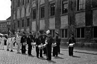 Opnamen van de Vest. De trapgeveltjes links nu nrs 22 en 24. (No. 5318). - Einde laatste kerkdienst van de r.k. kerk aan de Kleiweg, 31 juli 1964. Sloop start op 1 augustus.